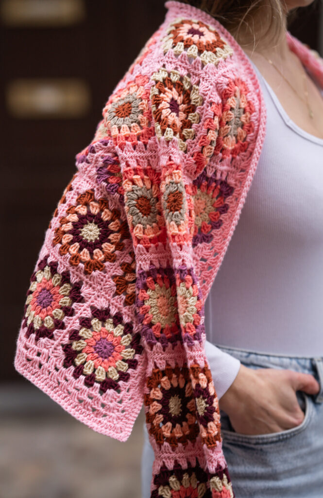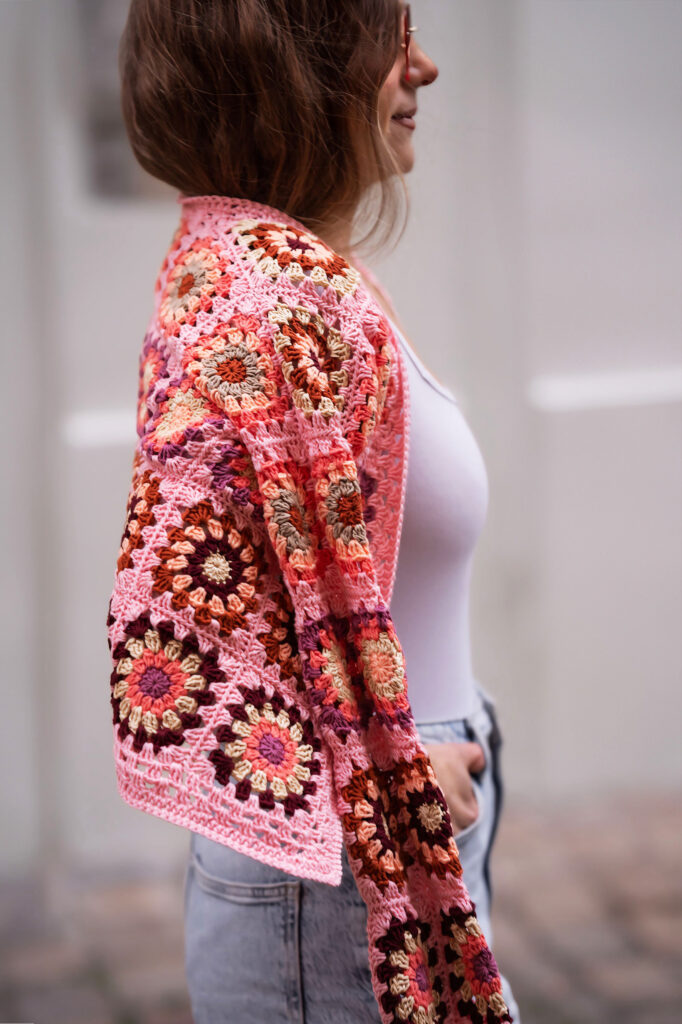 Jemný růžový granny square vzor působí měkce a žensky. Kardigan je háčkovaný z osmi pečlivě vybraných přízí – terakotové, bordó červené, růžové, korálově oranžové, broskvově oranžové, levandulové, oceánově zelené a khaki. Barvy spolu přirozeně ladí a vytvářejí boho harmonii, která dokáže rozzářit i ten nejjednodušší outfit.