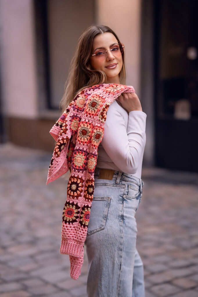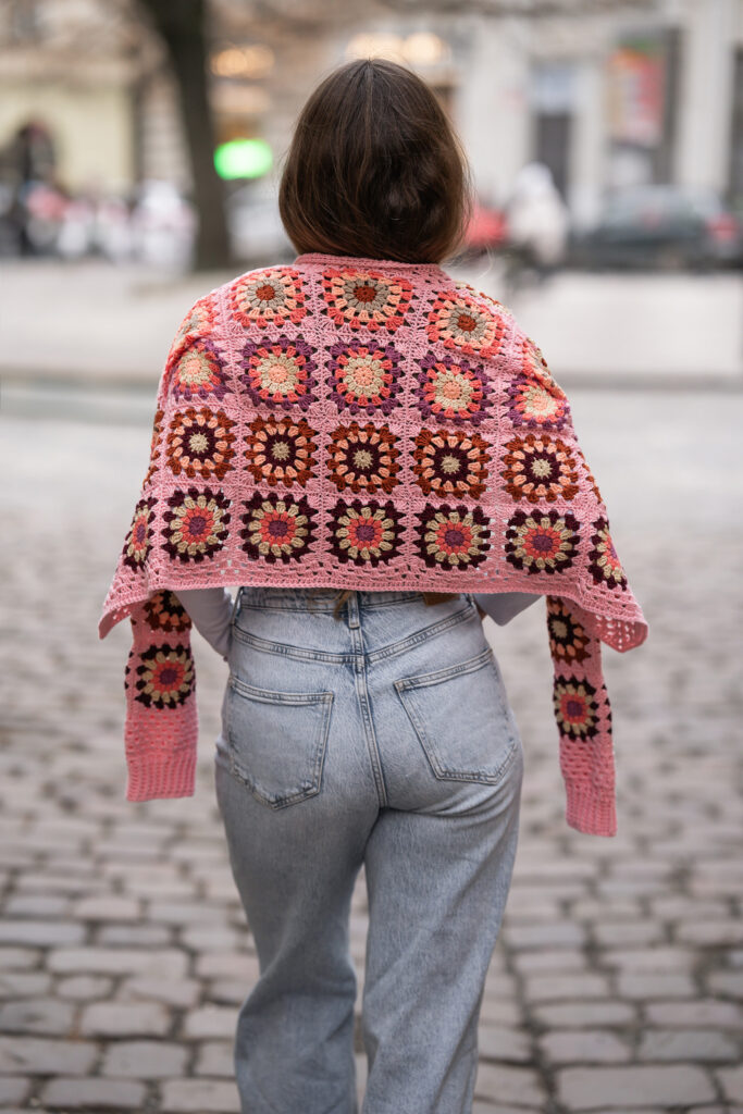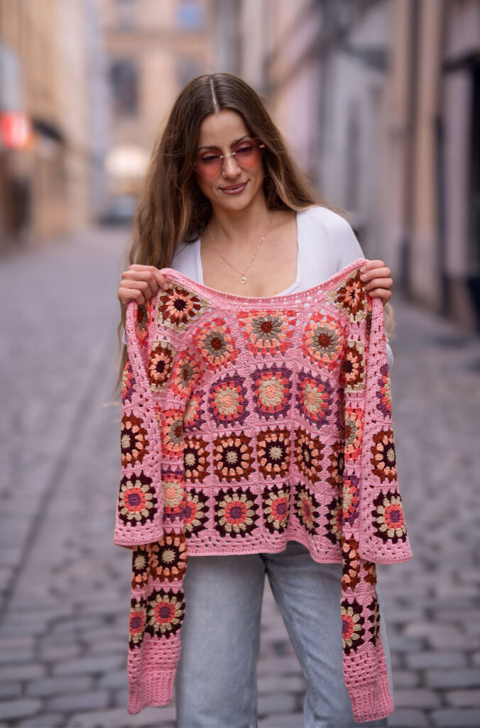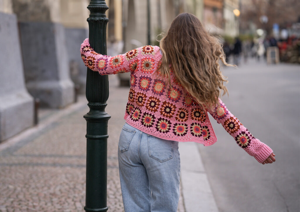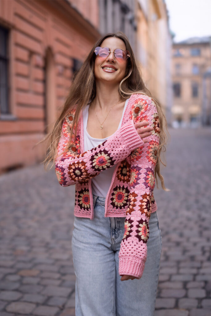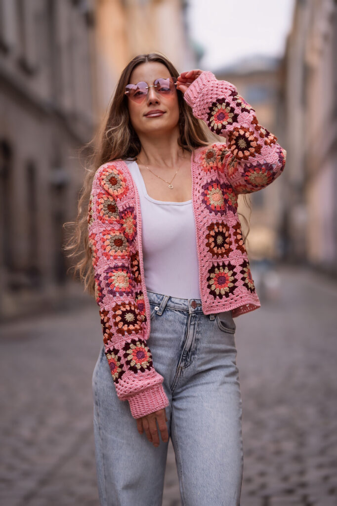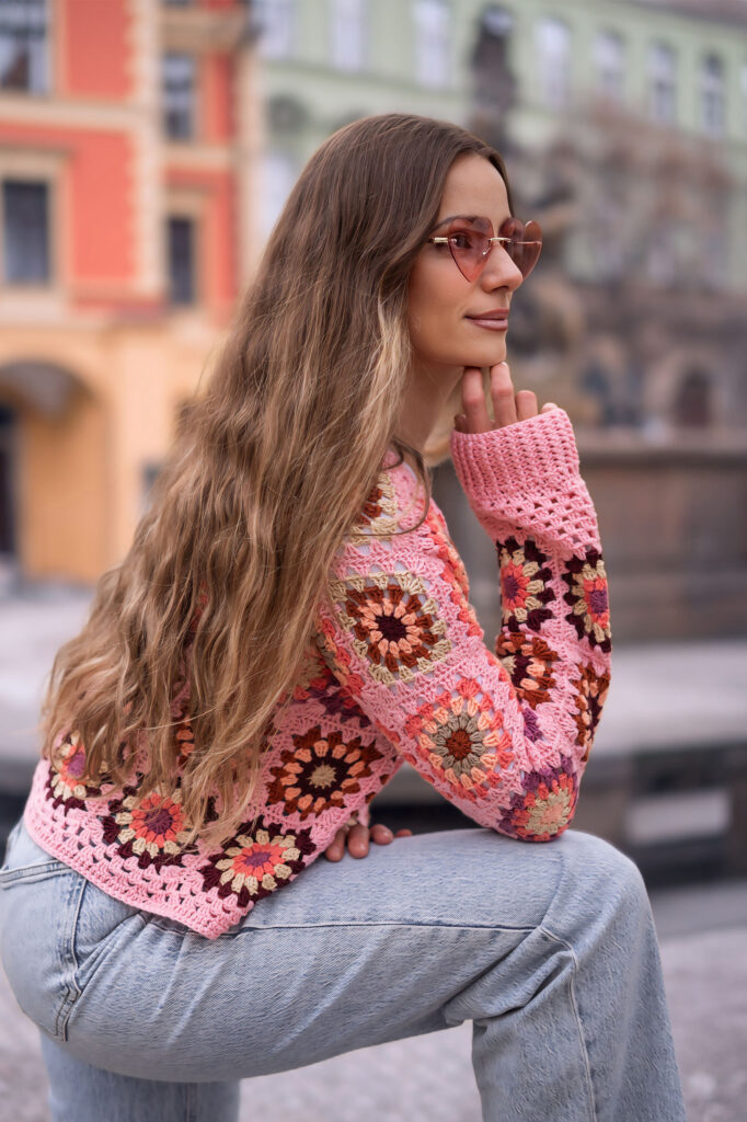 Jedním z nich je Granny square Boho Crochet Cardigan, který jsem pojmenovala Pink Horizon Dreamweaver. Vznikal pomalu, s jasnou vizí – vytvořit kardigan, který nebude jen hezký na fotkách, ale stane se přirozenou součástí ženského šatníku. Kouskem, po kterém sáhneš ráno, když chceš být pohodlná, ale zároveň se cítit krásná, svobodná a sama sebou.