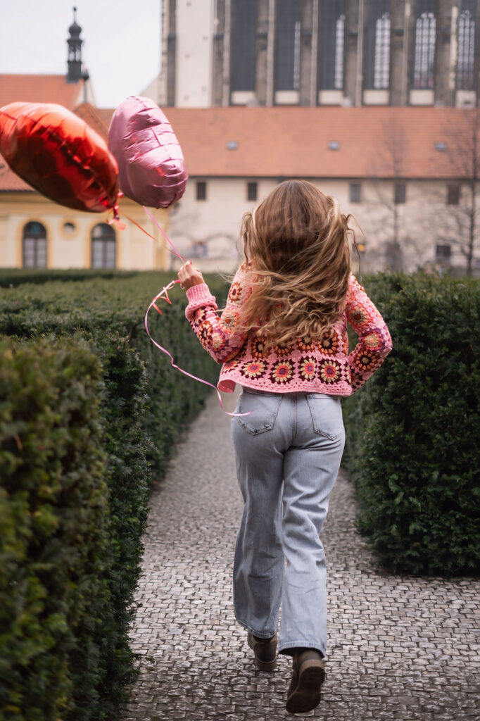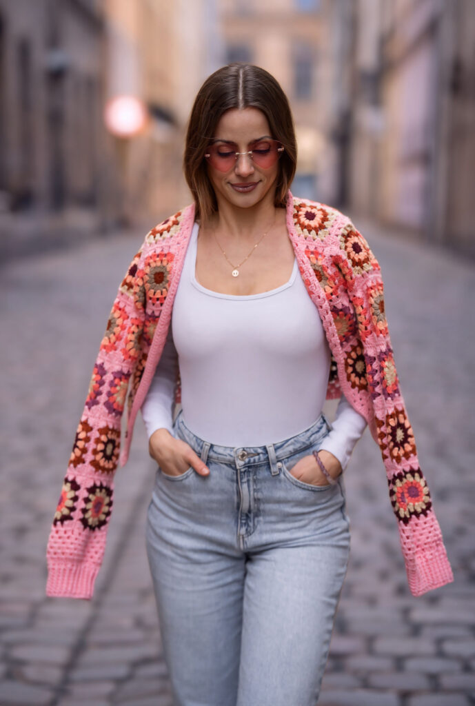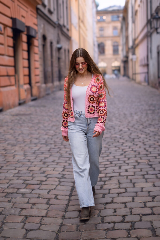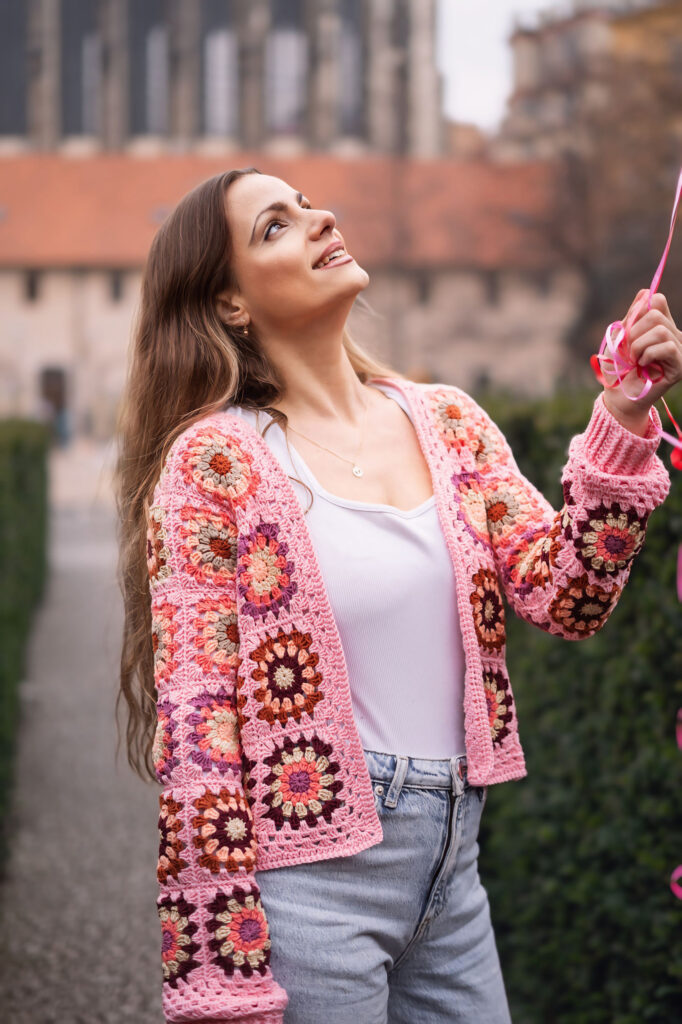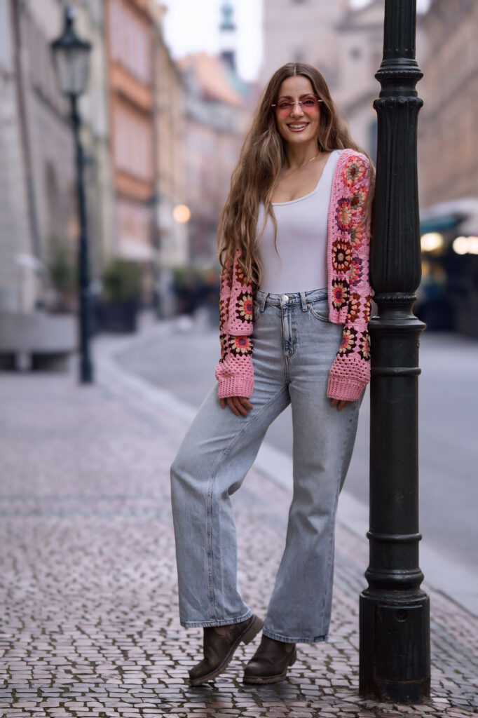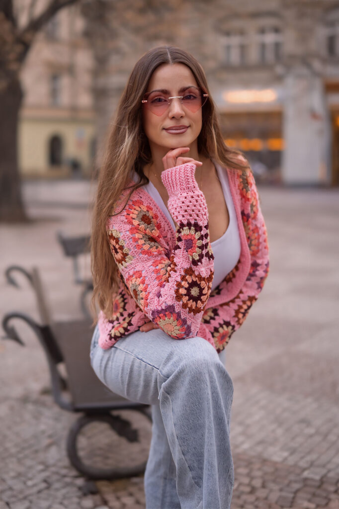 Abych ukázala, jak tenhle kardigan funguje v reálném životě, rozhodla jsem se pro focení v pražských ulicích. Staré Město, Františkánská zahrada, okolí ulice Na Perštýně a Uhelný trh nabídly dokonalé kulisy – městskou energii, evropský šarm i jemnou romantiku. Přesně v takovém prostředí Pink Horizon Dreamweaver krásně vyniká.